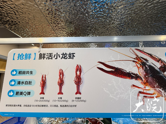 记者看到现场设置“抢鲜小龙虾”的标识,并标明“稻田共生、清水白肚、肥美Q弹”,价格牌则显示500克要49.9元。根据现场介绍,这些小龙虾是冷链速运18小时到店,其中中号虾500克在16到25只之间,大号虾500克在12到16只之间。
