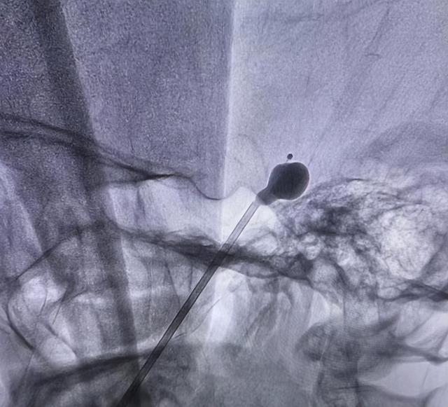 (▲透视显示球囊呈现典型梨形,提示术后疼痛消除良好)