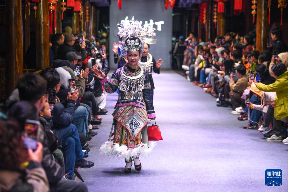 3月8日,人们在贵州省凯里市苗侗风情园观看“村T”民族服饰秀。