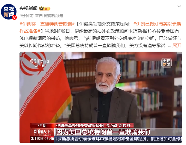 当地时间9日,伊朗最高领袖外交政策顾问卡迈勒·哈拉齐接受美国有线电视新闻网的采访。他表示,当前伊朗看不到外交解决冲突的空间,已经做好与美以长期作战的准备。“美国总统特朗普一直欺骗我们,美方没有遵守承诺,在谈判时袭击了我们。”他还称,伊朗军队强大且有作战动力,伊朗将像现在一样,继续全力以赴地应对美以带来的生存威胁。