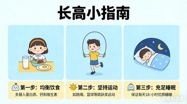 3.充足睡眠是另一个关键因素。生长激素主要在夜间深睡眠时分泌,特别是在晚上10点到凌晨2点之间。建议儿童晚上9点半前入睡,保证足够的睡眠时间。
