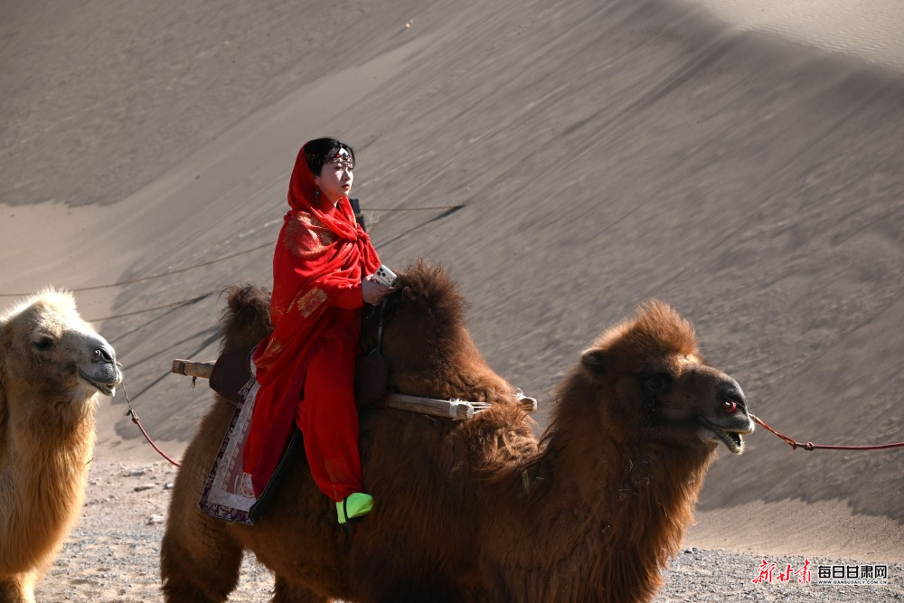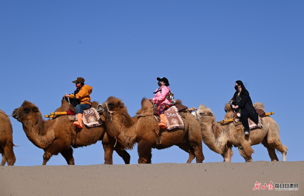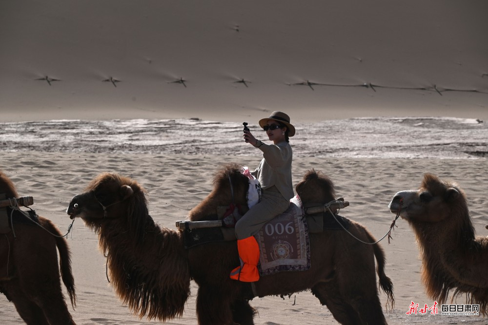 春日的敦煌沙海如画,游客们骑着骆驼穿行于沙峰之间,尽情领略大漠与清泉相依的独特景致,在轻松惬意的旅程中放松身心、定格美好瞬间,为景区增添了一抹亮丽的巾帼风采。