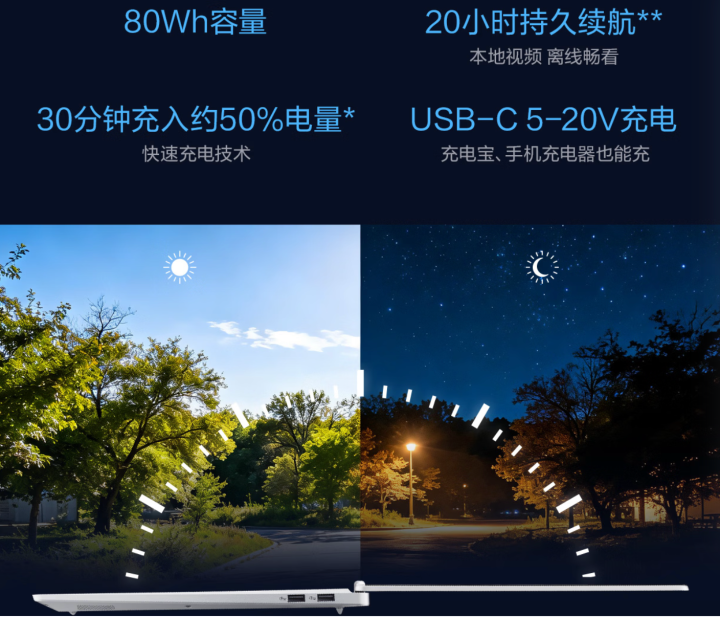 而针对紧急缺电场景,还有对应的高效快充技术来应对,30分钟即可充至约50%电量,利用碎片化的时间就能完成高效补能。更实用的是,它支持5V-20V宽幅充电,不仅能使用原装适配器充电,还能通过充电宝、手机充电器等设备补电,出差、旅行、户外办公时,无需担心充电设备不兼容的问题,移动办公的灵活性拉满。