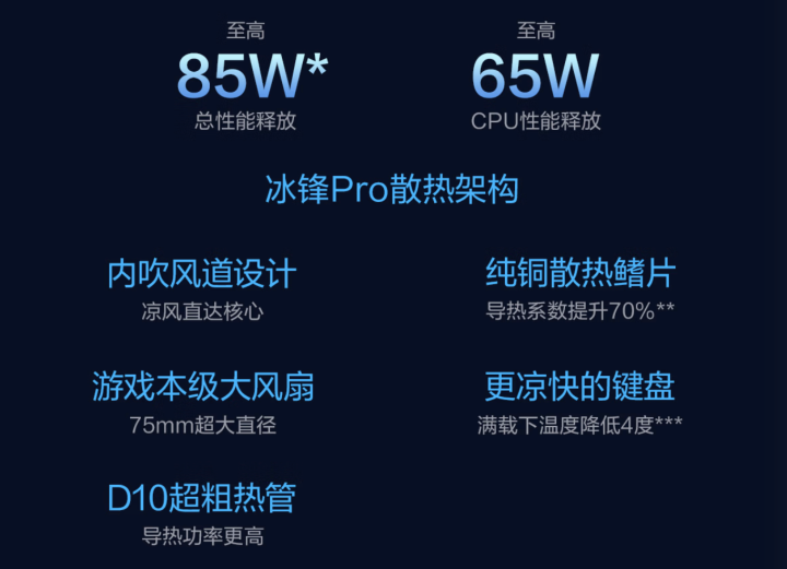 这套散热系统采用内吹风道设计,从根本上提升散热能力,让凉风直达核心发热区域,搭配D10超粗热管与导热系数提升70%的纯铜散热鳍片,能快速将机身内部的热量导出;再配合两只75mm超大直径的游戏本级大风扇,优化的扇叶设计,大幅提升风量与风压,散热效率较上代显著提升。
