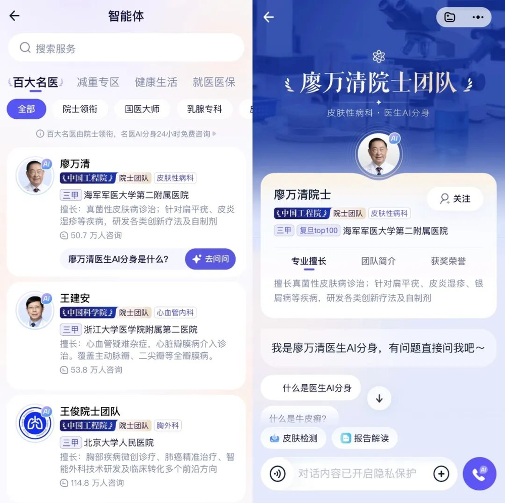 部分产品还引入了“数字分身”,在蚂蚁阿福,已有6位院士和1000多位三甲医院医生开通了AI分身,经医生本人授权训练并审核,让优质医疗资源的服务边界得到极大拓展。