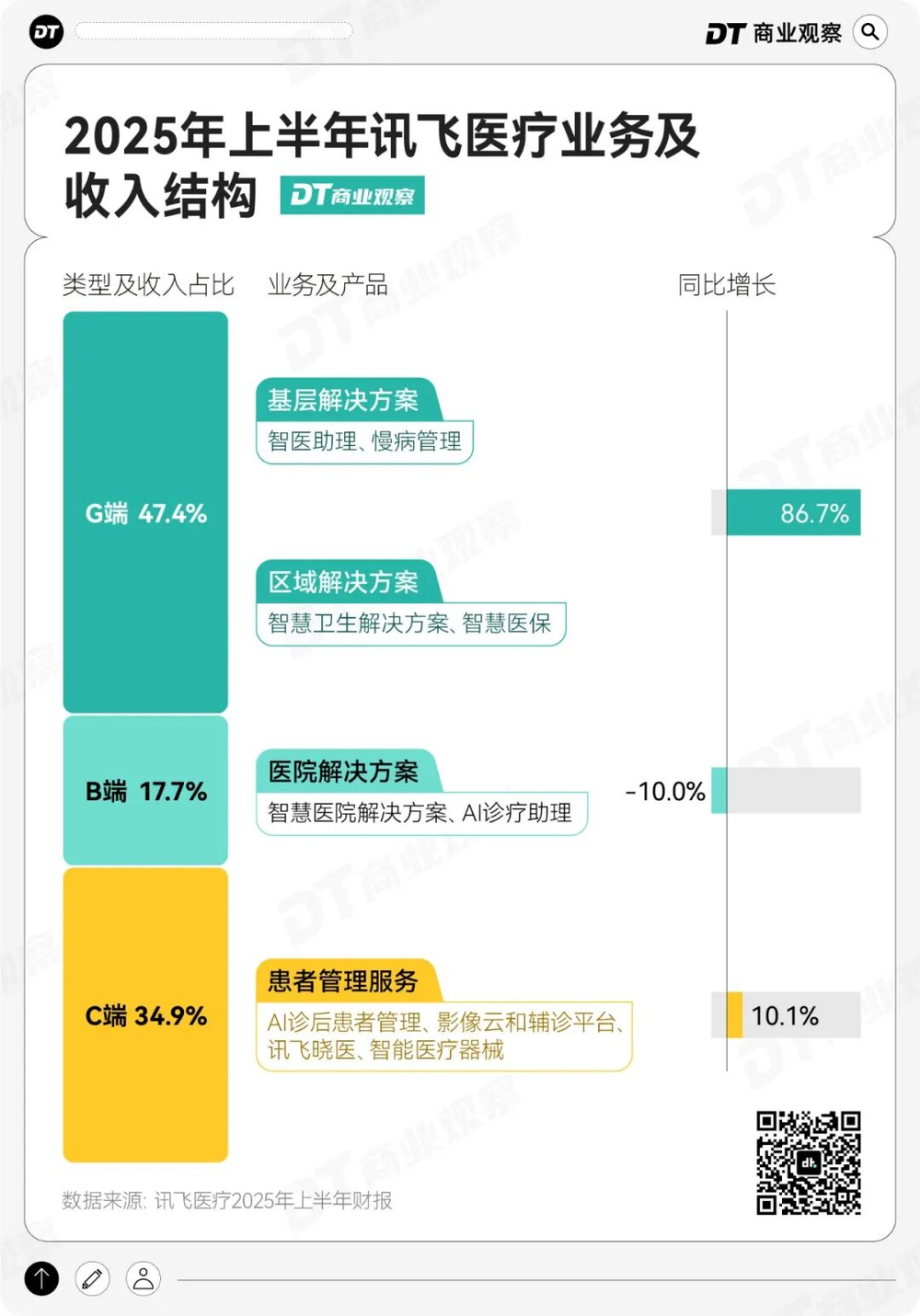 在这条赛道上,讯飞医疗作为早布局者,G端业务已成为其规模化收入的重要来源。2025年上半年,讯飞医疗G端业务收入占比47.4%,同比增长86.7%,远超C端10.1%的增速和B端-10%的下滑态势。