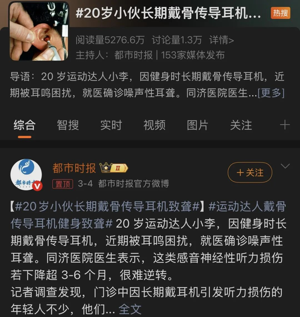 最近,一名20岁运动爱好者因长期在健身房佩戴骨传导耳机,导致不可逆的噪声性耳聋事件引发热议,将炒得火热的骨传导耳机推上舆论风口。