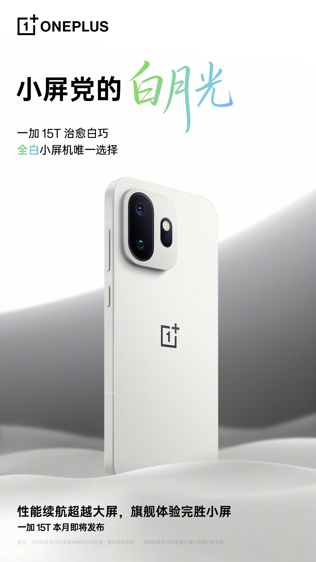 他还强调,这次产品的金属中框与背板都采用白色处理,整体观感干净统一。如果用户希望寻找一款全白设计的小屏手机,那么一加15T的“治愈白巧”将提供一种颇具辨识度的选择。