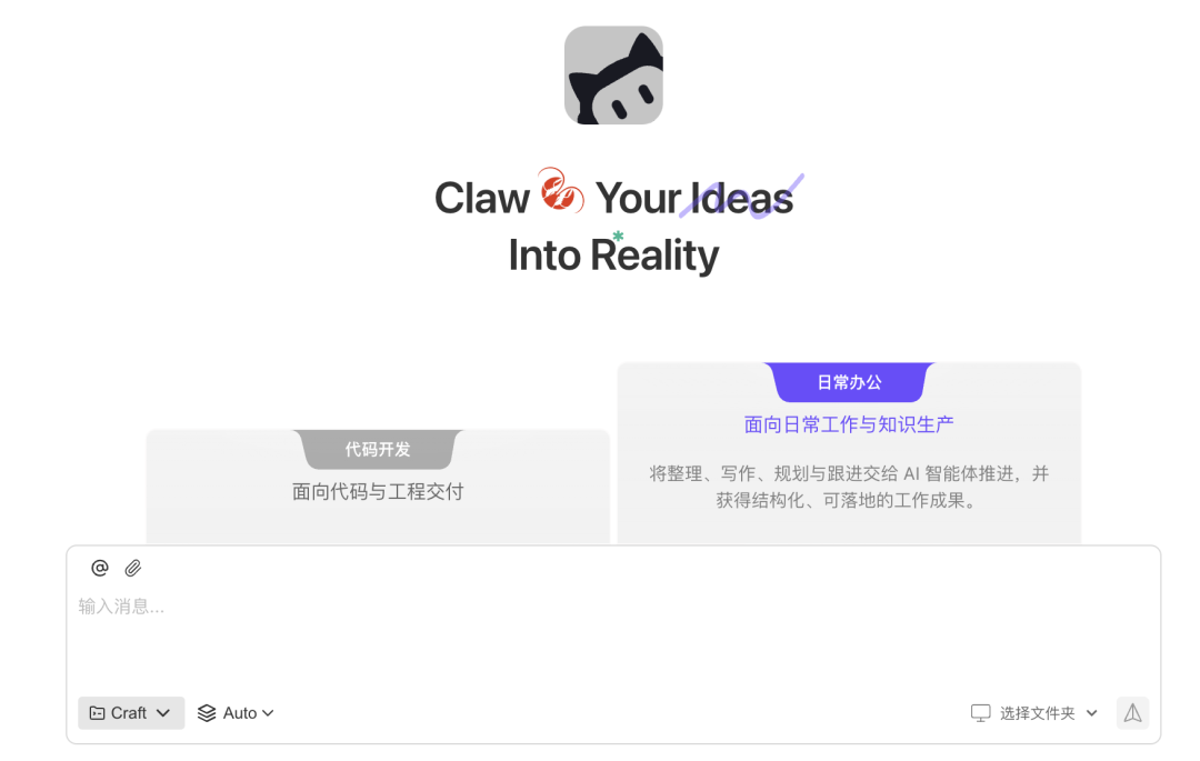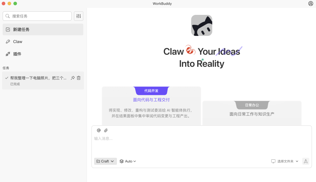 WorkBuddy属于典型地不能再典型的AI Agent页面,主区域分成代码开发和日常办公两块,左侧则放了新建任务、Claw、和插件三个入口,be like: