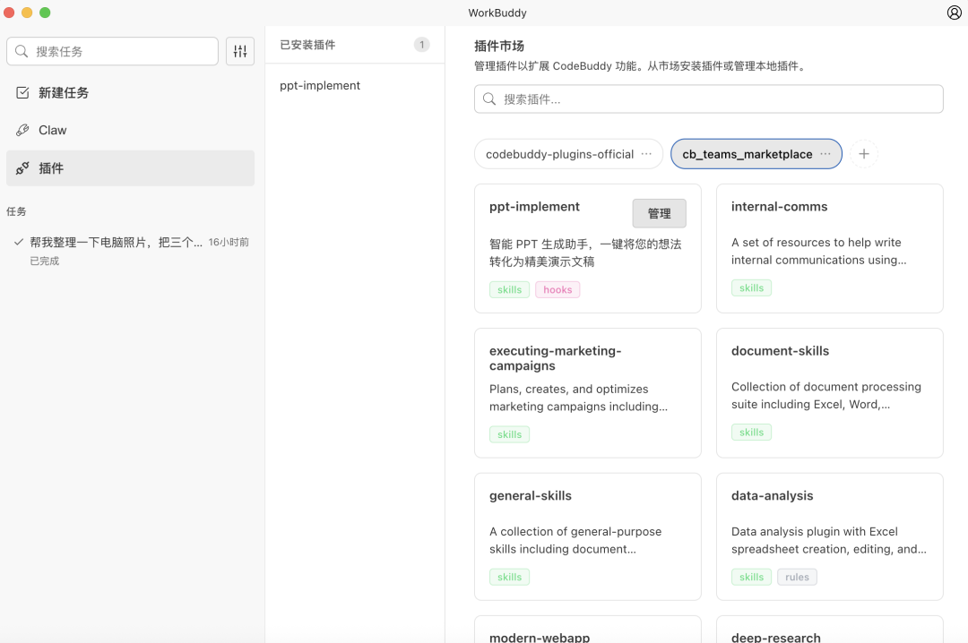 WorkBuddy更偏向一个面向多场景的AI Agent,重点放在日常工作流和实际任务承接上,不过大家熟悉的那套OpenClaw技能它也照样兼容~