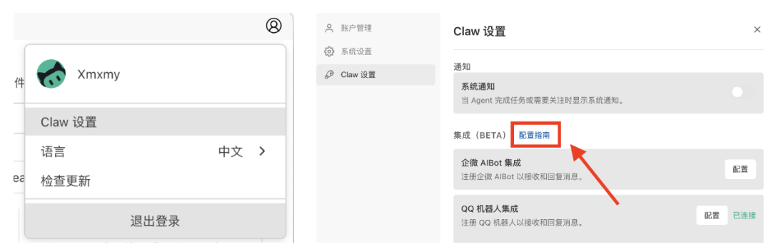 我们需要在右上角头像-Claw设置里,找到「配置指南」,指南文档写的还是蛮详细的,根据步骤一步步操作就ok~