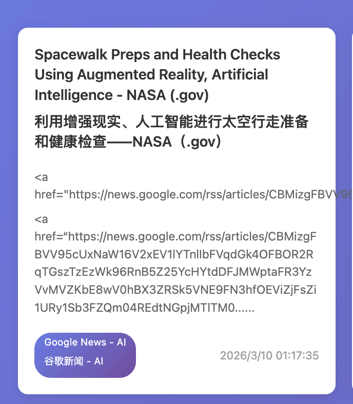 当然了,这个生成结果更适合当一个自动更新的资讯聚合页来看,离真正成熟的信息筛选系统maybe还有点距离。