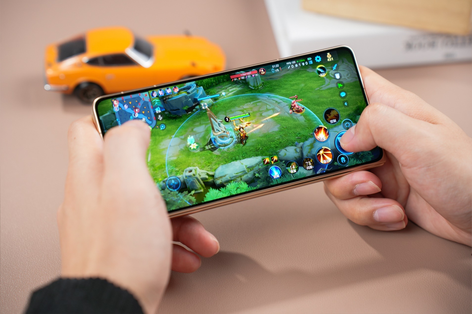 下一Part是游戏,外屏半小时《王者荣耀》,电量剩余84%,消耗5%电量,得益于满血第五代骁龙8至尊版移动平台,荣耀Magic V6的游戏体验轻轻松松120帧满帧运行无卡顿、无掉帧,机身无明显发烫。继续在内屏进行半小时《和平精英》,电量剩余77%,消耗7%电量,内屏大屏让游戏视野更开阔,操作更精准便捷,多任务图形渲染毫无压力,续航消耗也仍在合理区间。