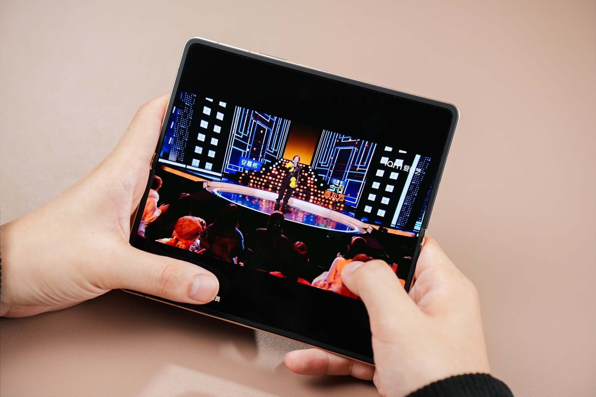 首先进行外屏半小时微信,电量剩余93%,仅消耗2%电量,微信聊天、处理工作全程流畅,外屏1.18mm的超窄黑边让视觉体验更沉浸,轻薄机身单手握持毫无压力;接着切换至内屏进行半小时爱奇艺视频播放,电量剩余89%,40分钟消耗4%电量,7.95英寸至臻黑钻屏带来超大视野,大宽幅看影视剧集极具沉浸感,而且在这期间,我甚至忘了折痕这回事,完全是平板的感觉。