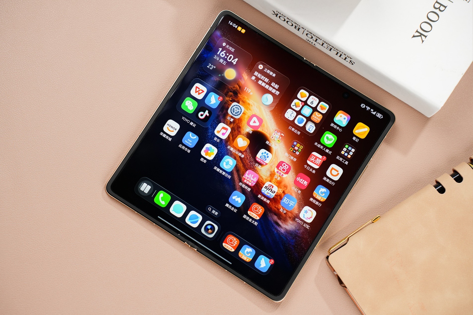 而在续航之外,荣耀Magic V6的轻薄手感与生产力体验更是锦上添花,4mm的展开厚度、8.75mm折叠厚度、219g整机重量,在展开时尽显轻薄,没有压手的厚重感,折叠时重量轻过旗舰大杯直板机,办公久握不累,通勤装包毫无负担。