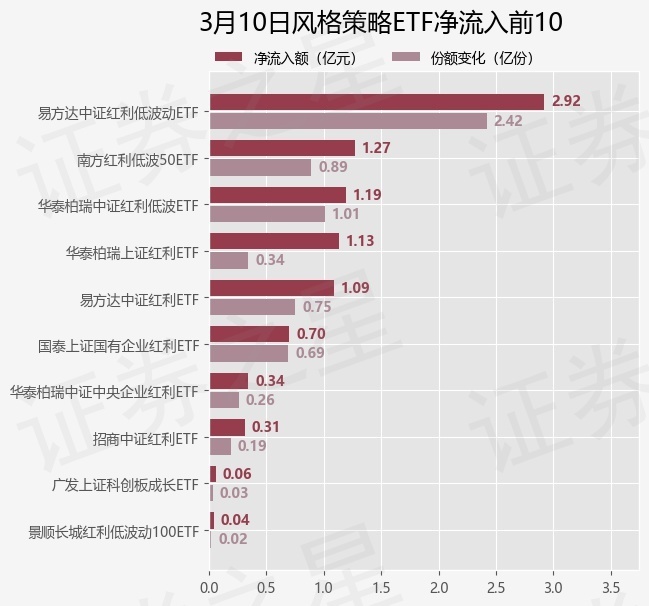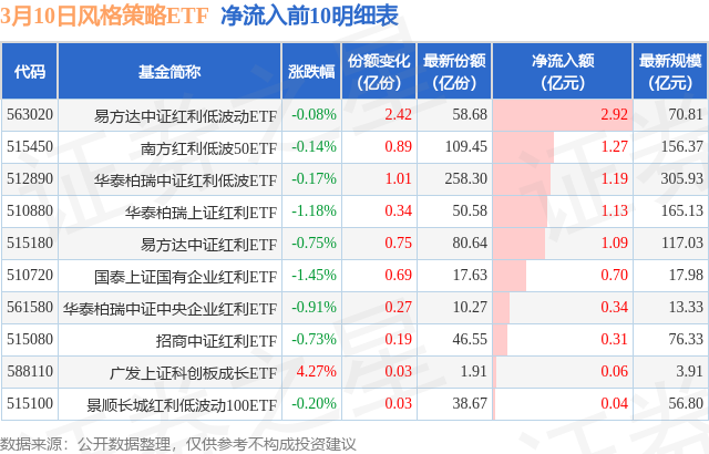 当日有15只风格策略ETF基金出现资金净流入,其中净流入排首位的是易方达中证红利低波动ETF(563020),份额增加了2.42亿份,净流入额为2.92亿元。