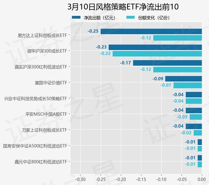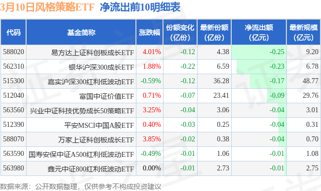 当日有9只风格策略ETF基金出现资金净流出,其中净流出排首位的是易方达上证科创板成长ETF(588020),份额减少了1200.0万份,净流出额为2496.28万元。