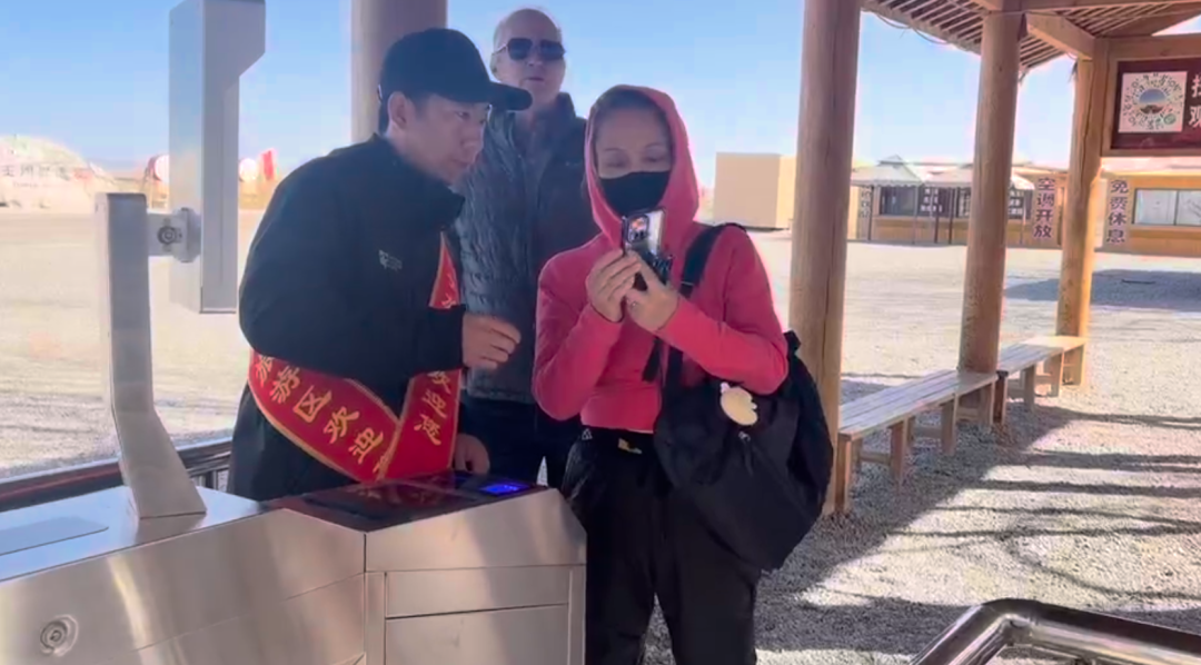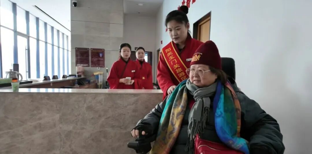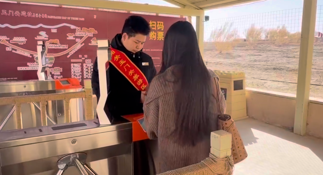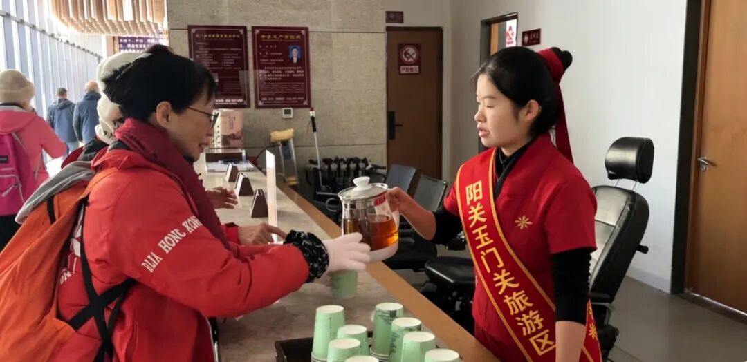 游客休息区旁,党群服务站的志愿者们为远道而来的游客递上一杯热水。这细微而真诚的善举,伴着戈壁和煦的春风,在千年雄关之下漾开阵阵温暖的涟漪。