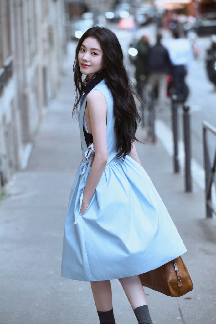 刘浩存亮相巴黎时装周 蓝裙造型尽显灵动气质