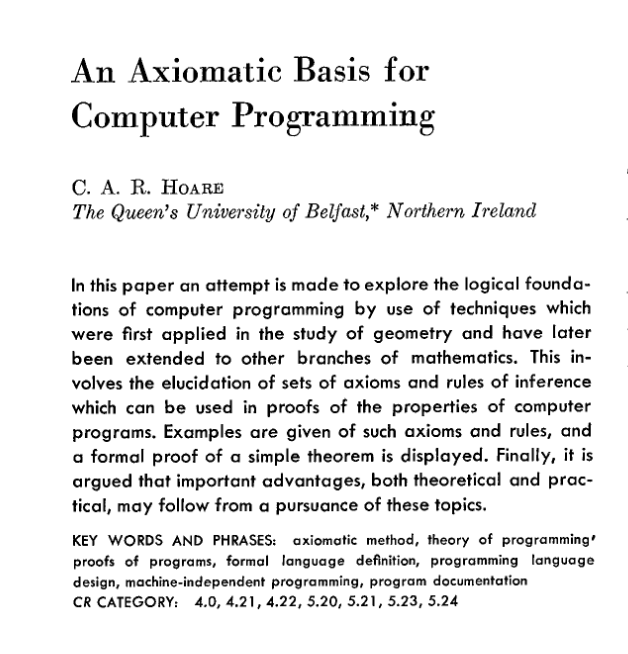 这篇1969年发表的论文《计算机编程的公理基础》(An Axiomatic Basis for Computer Programming),成为编程理论领域最具影响力的论文之一。