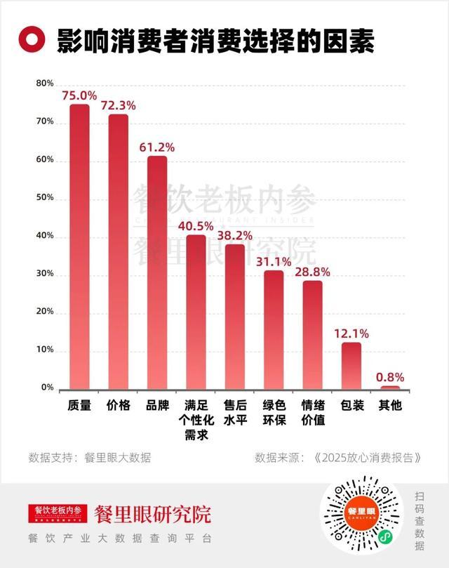 中国餐饮同样步入了“品质增长周期”,这一点在自助餐赛道尤为明显。消费者对自助餐的需求迭代,他们不再执着于“吃回本”,反而更看重食材品质、用餐体验与健康属性。《2025 放心消费报告》的一组数据印证了这一趋势:影响消费选择的因素中,质量(75.0%)的重要性,甚至已经赶超价格(72.3%),位列第一。