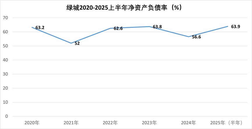 从数据看,2020年-2025年上半年,绿城净资产负债率一直在波动,从63.2%略微涨至63.9%,达到近五年以来的高点。