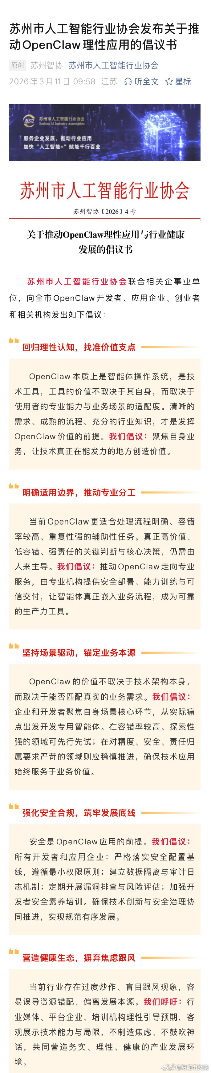 【#苏州人工智能协会发布OpenClaw倡议书#:呼吁不制造焦虑、不鼓吹神话】3月11日,苏州市人工智能行业协会联合相关企事业单位,向全市OpenClaw开发者、应用企业、创业者和相关机构发出倡议:推动OpenClaw走向专业服务,由专业机构提供安全部署、能力训练与可信交付,让智能体真正嵌入业务流程,成为可靠的生产力工具;严格落实安全配置基线,遵循最小权限原则;建立数据隔离与审计日志机制;定期开展漏洞排查与风险评估;加强开发者安全素养培训。确保技术创新与安全治理协同推进,实现规范有序发展;行业媒体、平台企业、培训机构理性引导预期,客观展示技术能力与局限,不制造焦虑、不鼓吹神话,共同营造务实、理性、健康的产业发展环境。