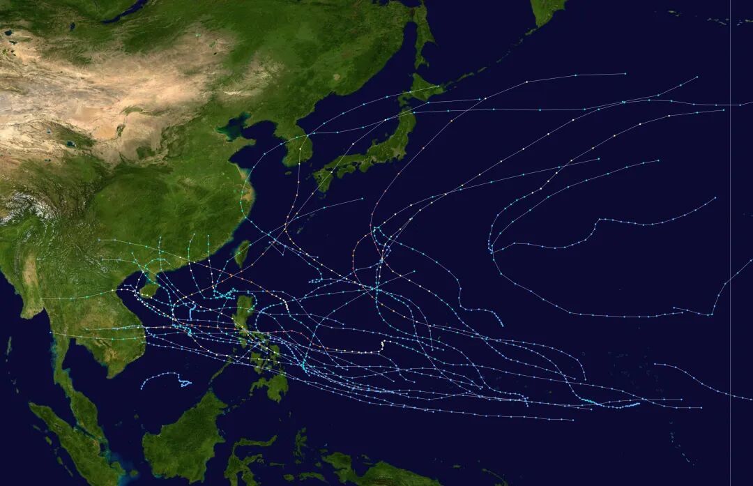 1995年台风季期间台风的轨迹,注意有些台风径直向西推进,而有些则向北偏转 | Nilfanion
