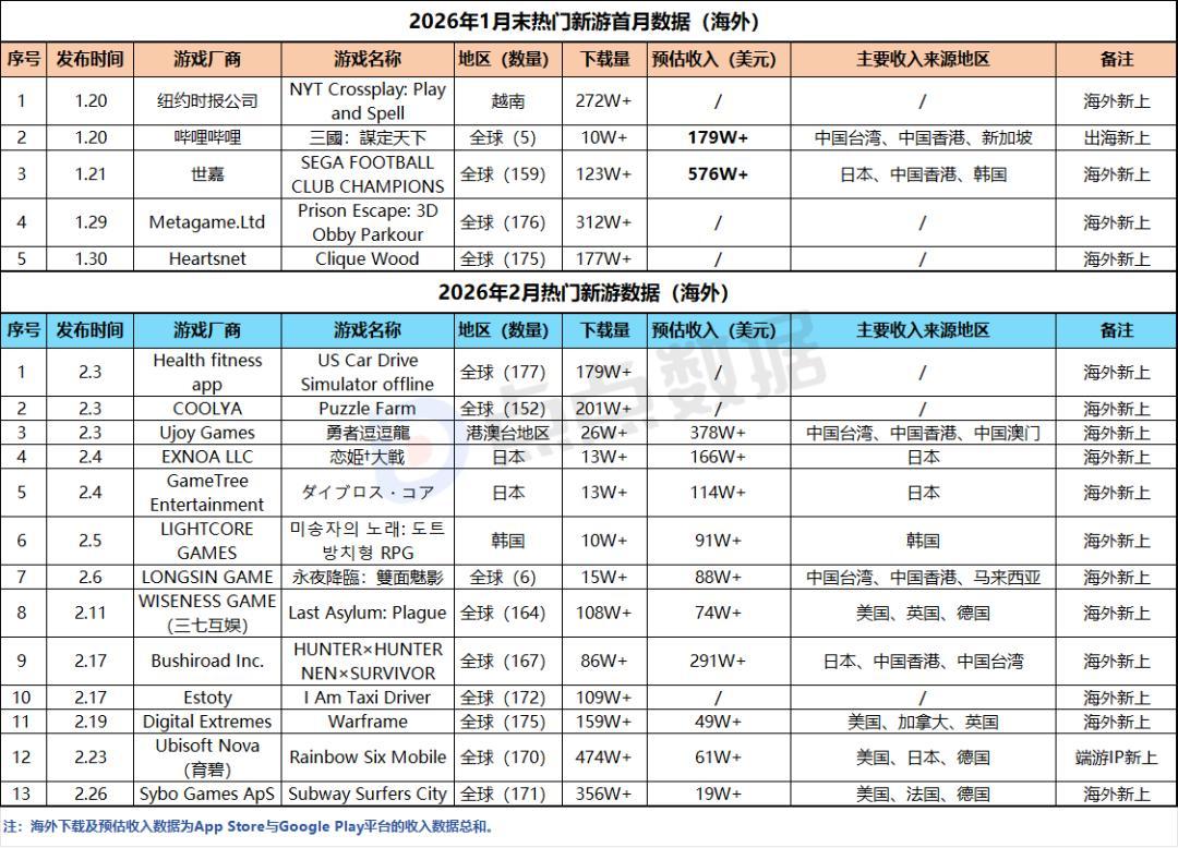 与此同时,同样于月底出海繁中地区,由哔哩哔哩发行,在国内三国题材SLG产品中硬生生闯出一片天地的爆款产品《三国:谋定天下》也于二月展现出其黑马之姿。承接开服活动后与《火鳳燎原》的联动活动帮助其进一步提升了热度,进而帮助该产品首月在繁中地区取得了超179万美元的预估收入。世嘉旗下新足球经营模拟游戏《SEGA FOOTBALL CLUB CHAMPIONS》也于二月展现出其IP在全球范围内的影响力,其首月预估收入最终定格于576万美元。