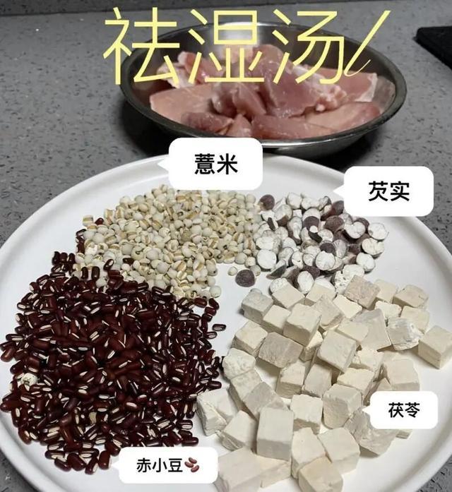 【食材】赤小豆30克(注意不是红豆)、炒薏米30克、芡实20克、茯苓20克、瘦肉250克、生姜3片。