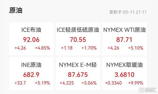 截至发稿,WTI原油日内涨超5%,报87.71美元/桶;布伦特原油日内涨近5%,报92.06美元/桶。
