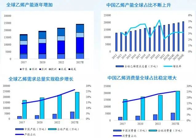 2023年全球乙烯产能突破2亿吨,中国年产能超4000万吨,是全球最大生产国;根据HIS预计,到2027年,中国乙烯产能将占到全球25%。