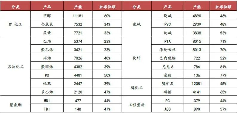 表:中国化工品在全球的产能份额(万吨/年)资料来源:卓创资讯、招商银行研究院