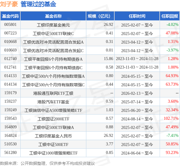 证券之星消息,2026年3月12日,工银中证1000指数增强(016942)发布公告,增聘刘子豪为基金经理,任职日期自2026年3月12日起,变更后工银中证1000指数增强(016942)的基金经理为何顺,刘子豪。截止2026年3月11日,工银中证1000指数增强净值为1.5725,较上一日上涨0.11%,近一年上涨47.67%。