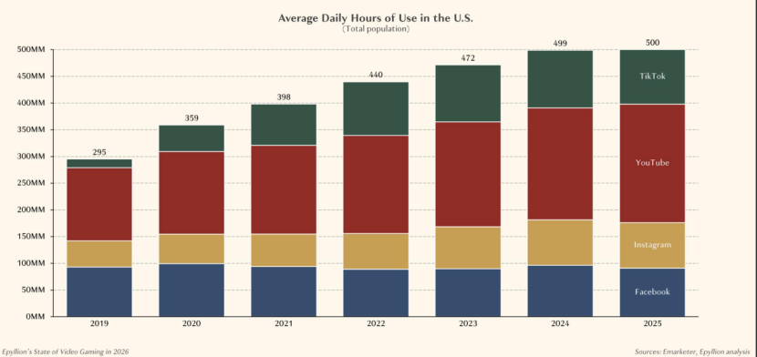 与我们熟悉的中国市场相似,短视频虽然对游戏并不构成商业模式的直接竞争,但对玩家时长和注意力资源的侵蚀仍然是“房间里的大象”。以美国市场为例,全美网民在以Tiktok/Youtube为代表的社交媒体上耗费的时间较之20/21年多了1.22亿小时,相当于每人每天21分钟。