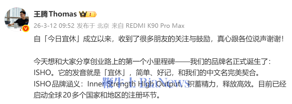 3月12日,今日宜休创始人王腾发长文正式公布其英文品牌名“ISHO”。