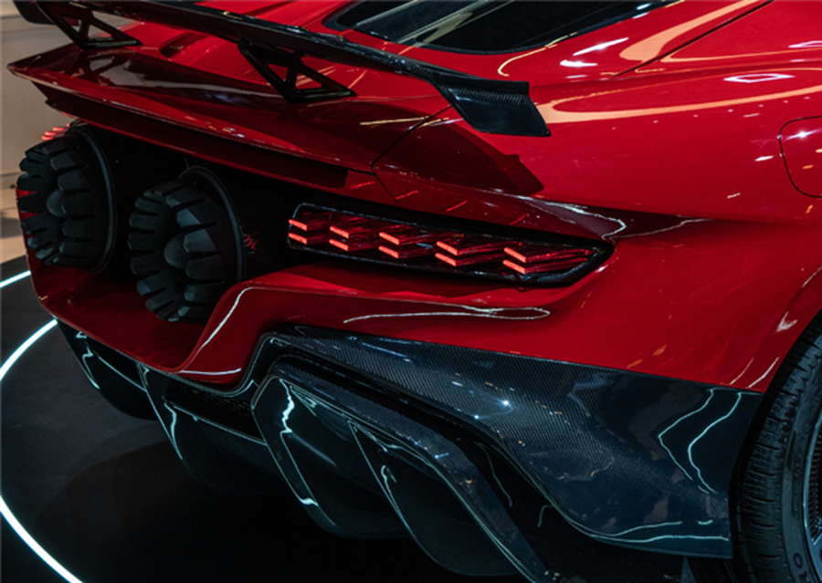而另一款火箭车Nebula Next 01 Jet Edition,更是夸张到让人眼前一亮。它延续了战斗风的造型设计,采用醒目的红色车漆,重点优化了尾部设计,不仅加入了全新样式的尾灯,还直接配备了两个固体燃料火箭助推器,搭配专属的“喷火”装置,科幻感直接拉满,远远望去就像从未来穿越而来的座驾,瞬间成为展会全场的焦点。