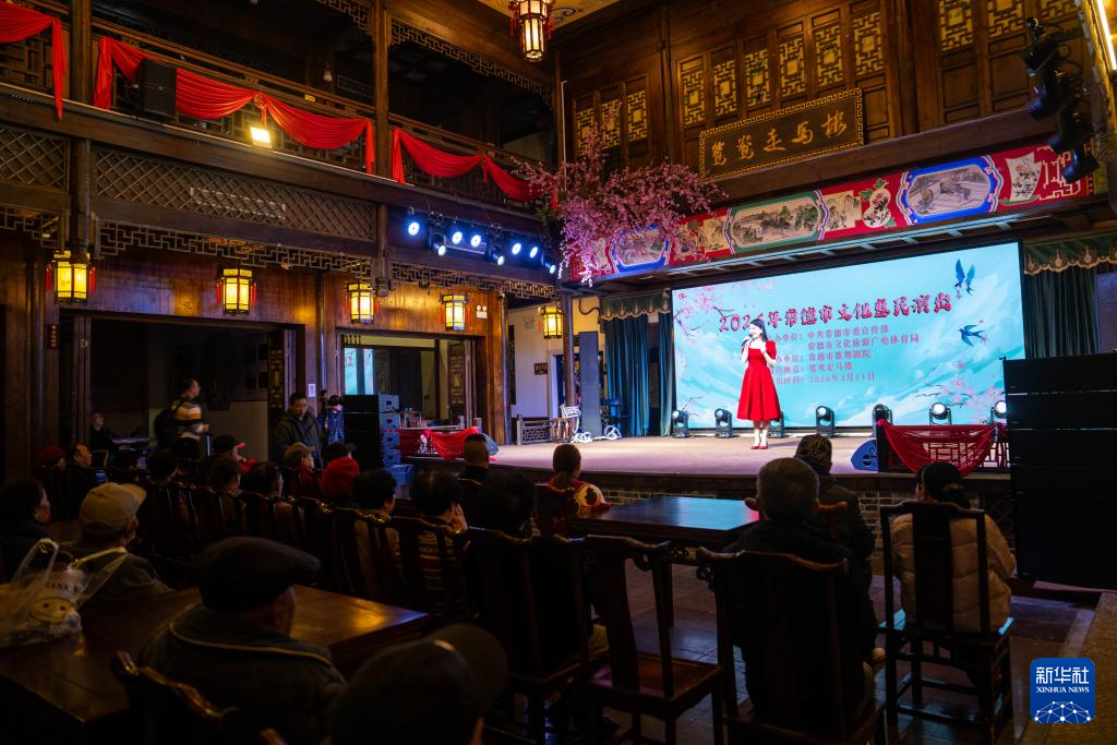 3月11日,在常德穿紫河畔的鸳鸯走马楼,文艺工作者为游客带来惠民演出。