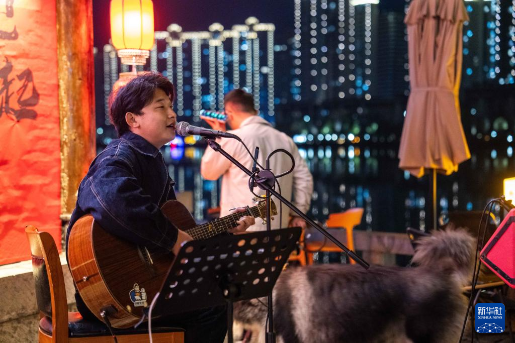 3月10日,歌手在穿紫河畔的常德河街弹唱。
