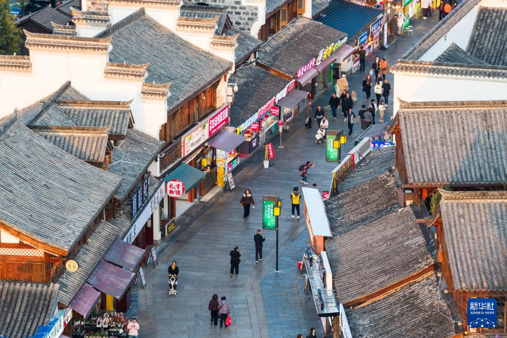 3月11日,游客在穿紫河畔的常德河街游玩(无人机照片)。