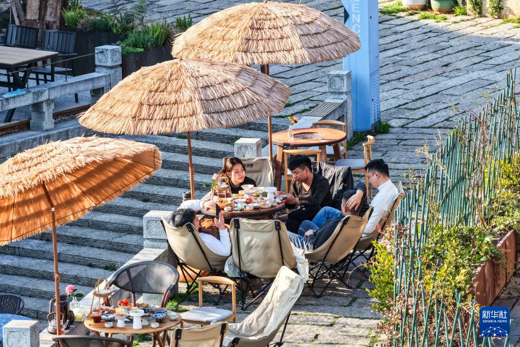 3月11日,游客在穿紫河畔的常德河街品茶。