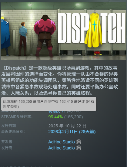 在今天这个时间点,恐怕没有一款游戏比《超英派遣中心》更有资格起这个标题。截止2026年初,这款号称“超级英雄职场喜剧”的游戏,已经售出了超过300万份,且在Steam上有着高达96%的总体好评率。
