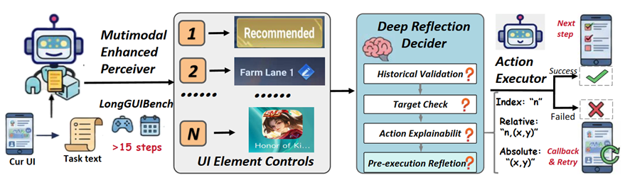 深度反思决策模块(DRD) 通过严格定义的 JSON Schema 输出格式,强制模型进行三级闭环推理。第一级是历史验证,检查上一步操作是否成功执行,UI 状态转换是否符合预期;第二级是目标检查,提取当前屏幕的关键信息并与任务目标进行一致性比对;第三级是动作可解释推理,要求模型在给出执行指令之前先说明当前界面状态、定位依据和操作理由。在执行前,DRD 还会校验目标元素是否确实存在于当前屏幕上、动作语义是否与任务描述匹配,不满足条件的动作会被拒绝并触发修正。