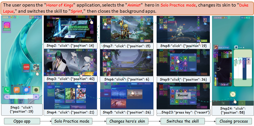 每条任务同时提供两级指令标注:High-Level 指令描述宏观目标(如 "在游戏商城购买 XX 道具"),Low-Level 指令则分解为原子操作序列(如 "点击商城按钮"→"选择购买")。所有操作步骤均配有精细的 UI 语义标注,包括控件类型、bbox 坐标和状态属性。全部数据合计 4508 张截图,经 6 位专业人员跨模态对齐和人工去噪后生成标准化标注。