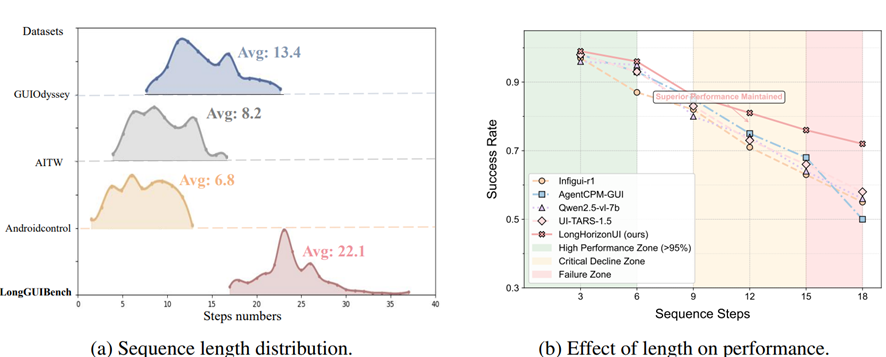 研究团队首先在 AndroidControl 基准上对多个主流方法做了按步长分段的性能评估。结果很直观:当操作序列在 5 步以内时,各方法的平均成功率超过 90%;但一旦序列长度超过 10 步,成功率便跌破 75%;到了 15 步以上,平均仅剩约 60%。