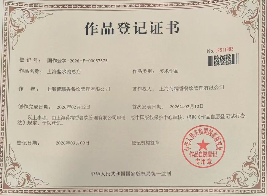 目前,顾顺兴在杨浦区打虎山路68号与虹口区祥德路202号设有门店,提供现斩堂食、真空打包及礼盒定制等多样化服务。品牌方表示,著作权认证的落地将推动其进一步完善供应链管理、产品标准化体系,助力金陵盐水鸭文化在上海的传承与传播。