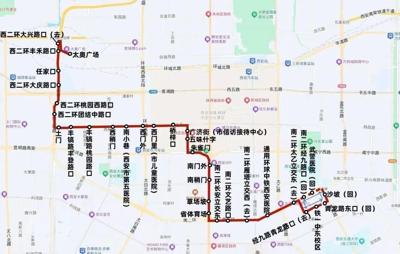 线路设置站点33个:太奥广场、西二环大兴路口(去)、西二环丰禾路口、任家口、西二环大庆路口、西二环桃园西路口、西二环团结中路口、土门、丰镐路丰登路口、丰镐路桃园路口、西稍门、南小巷(西安市第五医院)、西门外、西门里(市儿童医院)、桥梓口、广济街(市信访接待中心)、五味什字、朱雀门、南门外、南稍门、草场坡、省体育场、南二环长安立交东、南二环文艺路口、南二环雁塔立交西(去)、通用环球中铁西安医院、南二环太乙立交东(去)、经九路青龙路口(去)、南二环经九路口(回)、武警医院(回)、沙坡(回)、青龙路东口(回)、铁一中东校区。