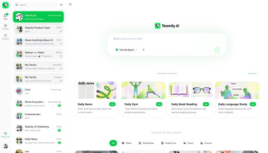 而在大洋彼岸,Teamily AI已经率先把「人和AI Agent共存于同一个社交网络」这件事做出来了——而且不是一个概念demo,是一个能处理图片、视频、长文,能在多人群聊中并行多任务,能零部署创建个人Agent,能跨群共享记忆的完整产品。