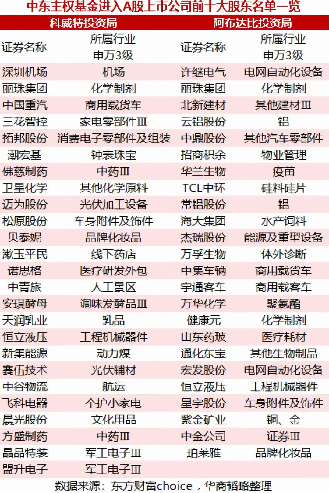 当然,比起找公司签合同认购股份,更省事的投法是直接在二级市场买。目前,A股上市公司中,前十大股东名单中有科威特投资局或者阿布达比投资局的上市公司就有49家,其中科威特投资局的有25家,阿布达比投资局的有24家。