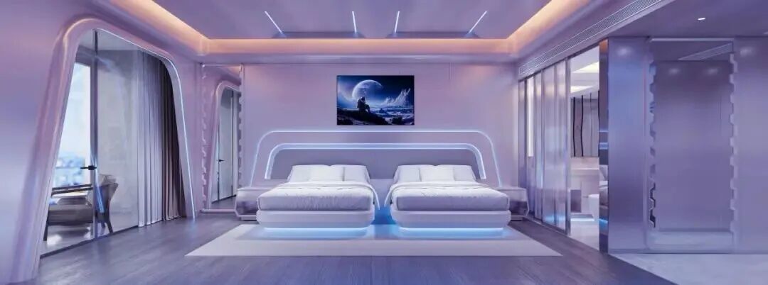 酒店本身的设计逻辑,也明显围绕这一点展开。整体风格以时尚与科幻为主线,客房体系被拆分为多个主题层级:亲子家庭可以选择两室一厅的家庭套房,强调私密与停留时间;年轻客群则被吸引进声光电技术打造的科幻主题房,强化沉浸式体验;商务客群则对应奢华商务房与高端套房。这种房型结构看似复杂,本质上是在用不同空间模块拆分客群,让一座超大体量酒店能够同时服务多种消费场景。